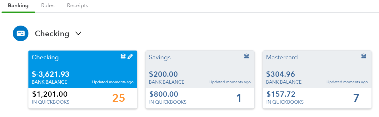 First off, the look of the bank and credit card tiles has changed. The font is a lot smaller; it is so much harder to read. What I have always loved about QBO over QuickBooks Desktop is the use of large fonts, so this is an unwelcome change.